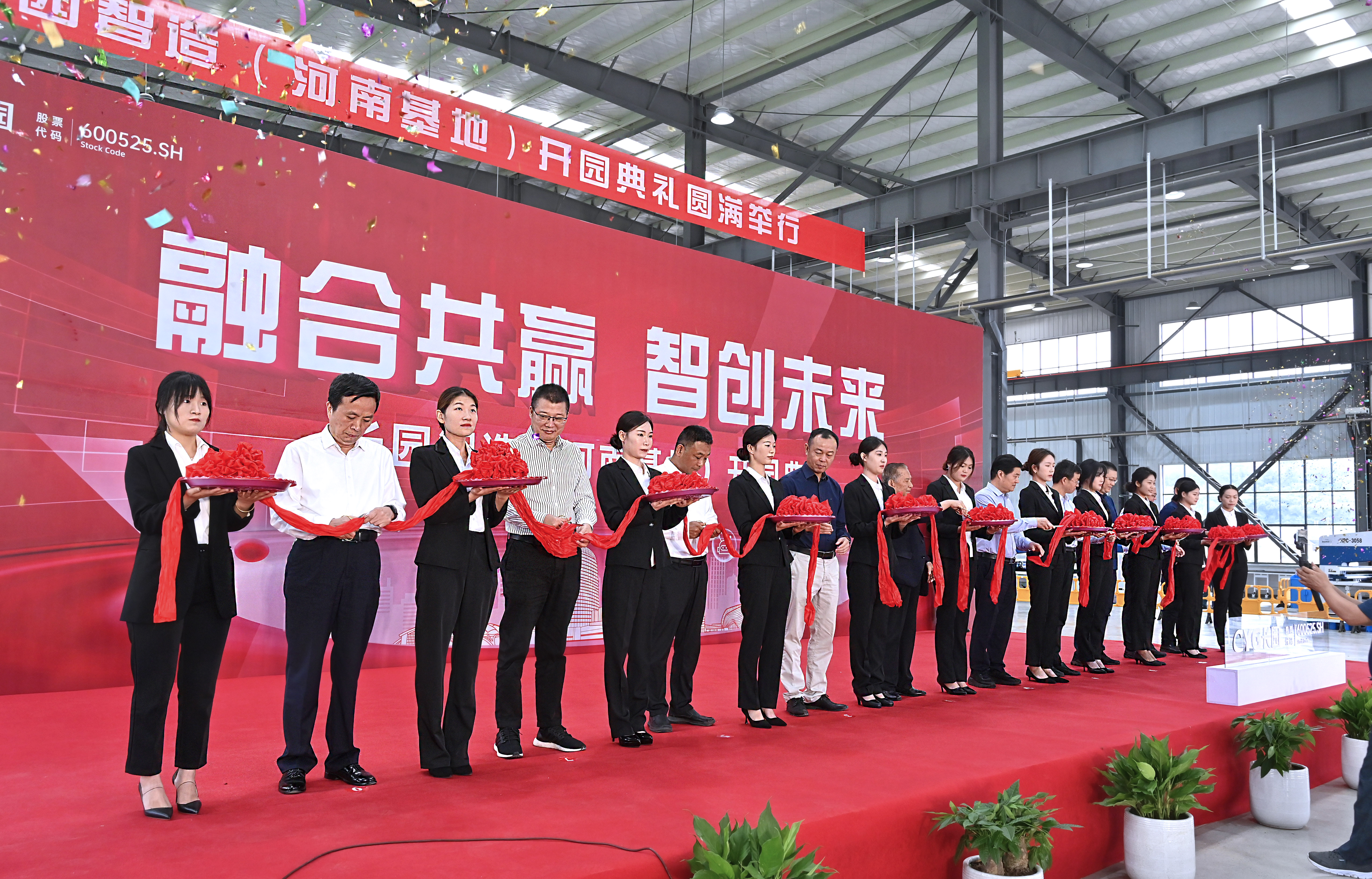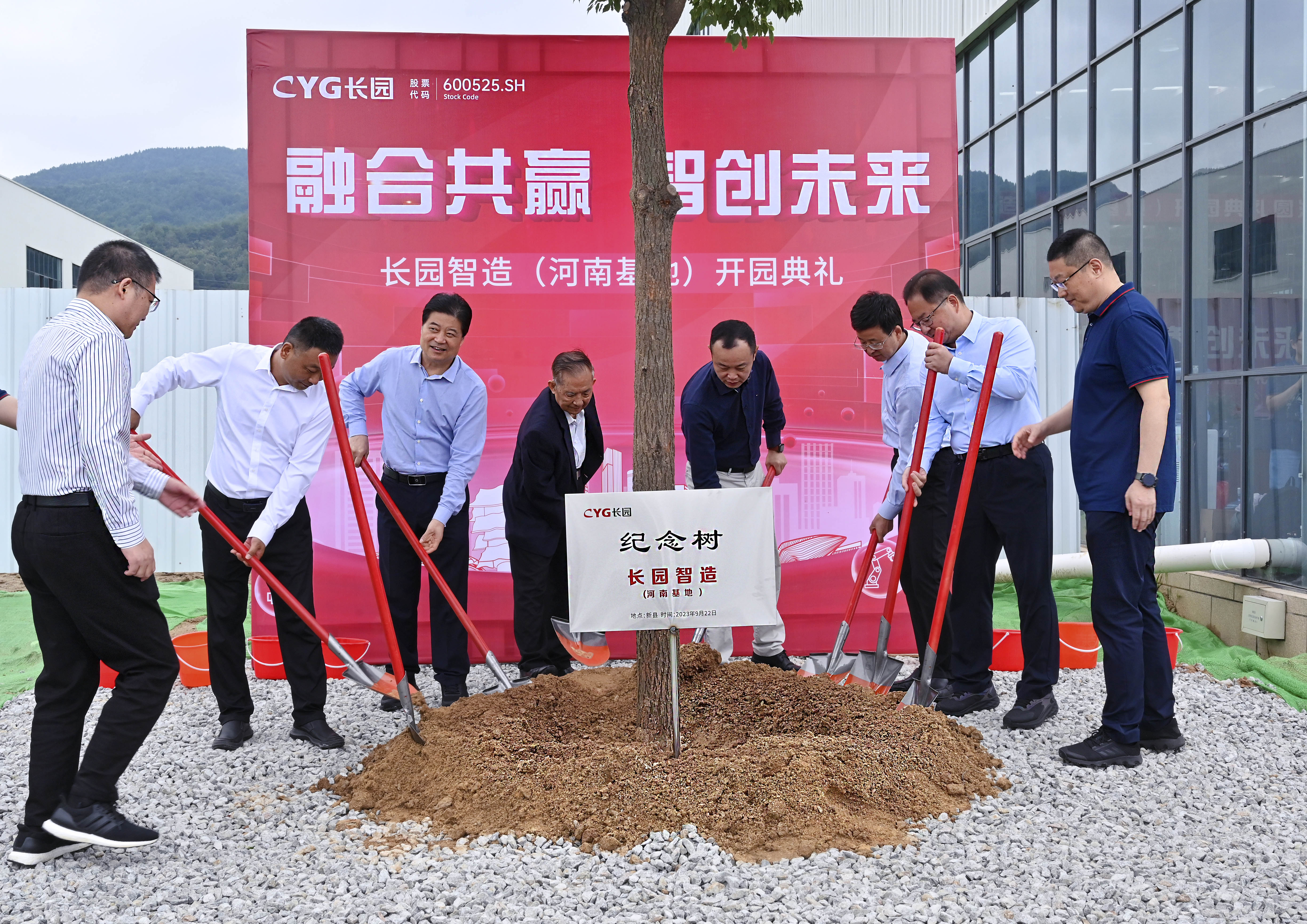 参与剪彩仪式的10位嘉宾领导在一声声倒数及礼炮声中同执金剪,并在基地共同种下一棵香樟树以作纪念。香樟树枝繁叶茂,四季常青,寓意着三亿体育智造(河南基地)将像香樟树一样生命力顽强旺盛、扎根新县繁荣生长。